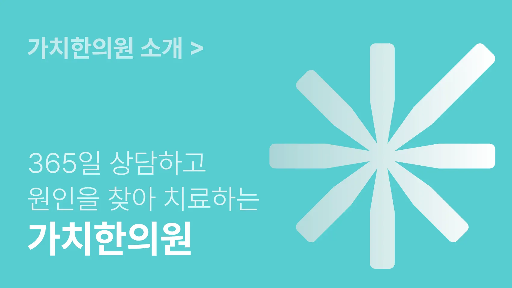 당신은 더 건강해질 가치가 있는 사람입니다. 몸과 마음의 건강함으로 당신의 가치를 유지하고 더해나가길 바랍니다. 내 몸에 가치를 더하는 방법을 찾는다면, 가치한의원이 언제나 함께 하겠습니다.